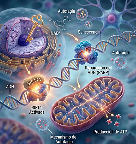 El NAD+ actúa como cofactor limitante para la actividad enzimática de las sirtuinas (SIRT1-7), una familia de proteínas que regulan la expresión génica, reducen la inflamación y protegen las mitocondrias del daño oxidativo. Además, es sustrato para las enzimas PARP (poli-ADP-ribosa polimerasas), responsables de detectar y reparar el daño en el ADN. Cuando los niveles de NAD+ son adecuados, estas enzimas funcionan eficientemente; su disminución se asocia con el envejecimiento celular, limitando la producción de energía, la reparación del ADN y la señalización genómica