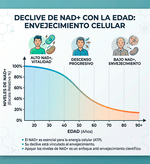 El NAD+ (nicotinamida adenina dinucleótido) es una coenzima que disminuye progresivamente con la edad. A los 30 años, los niveles celulares de NAD+ ya han comenzado a declinar; a los 50 años la reducción puede superar el 50% respecto a la juventud. Este descenso se asocia directamente con la disfunción mitocondrial, la acumulación de daño en el ADN y la pérdida de capacidad regenerativa de los tejidos. La reposición de precursores de NAD+ (como el nicotinamida ribósido – NR, o el nicotinamida mononucleótido – NMN) ha demostrado en estudios preclínicos y clínicos revertir múltiples marcadores de envejecimiento: mejora la función metabólica, aumenta la resistencia a la fatiga, protege las neuronas y reduce la inflamación sistémica. A nivel cutáneo, el NAD+ favorece la reparación de queratinocitos dañados por radiación UV y estimula la síntesis de colágeno mediante la activación de SIRT1.